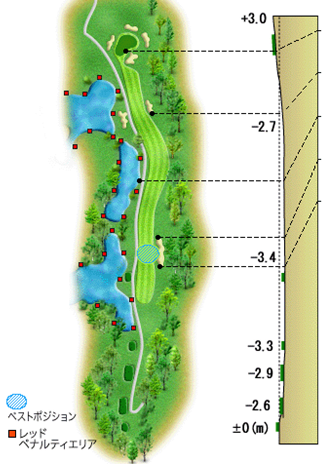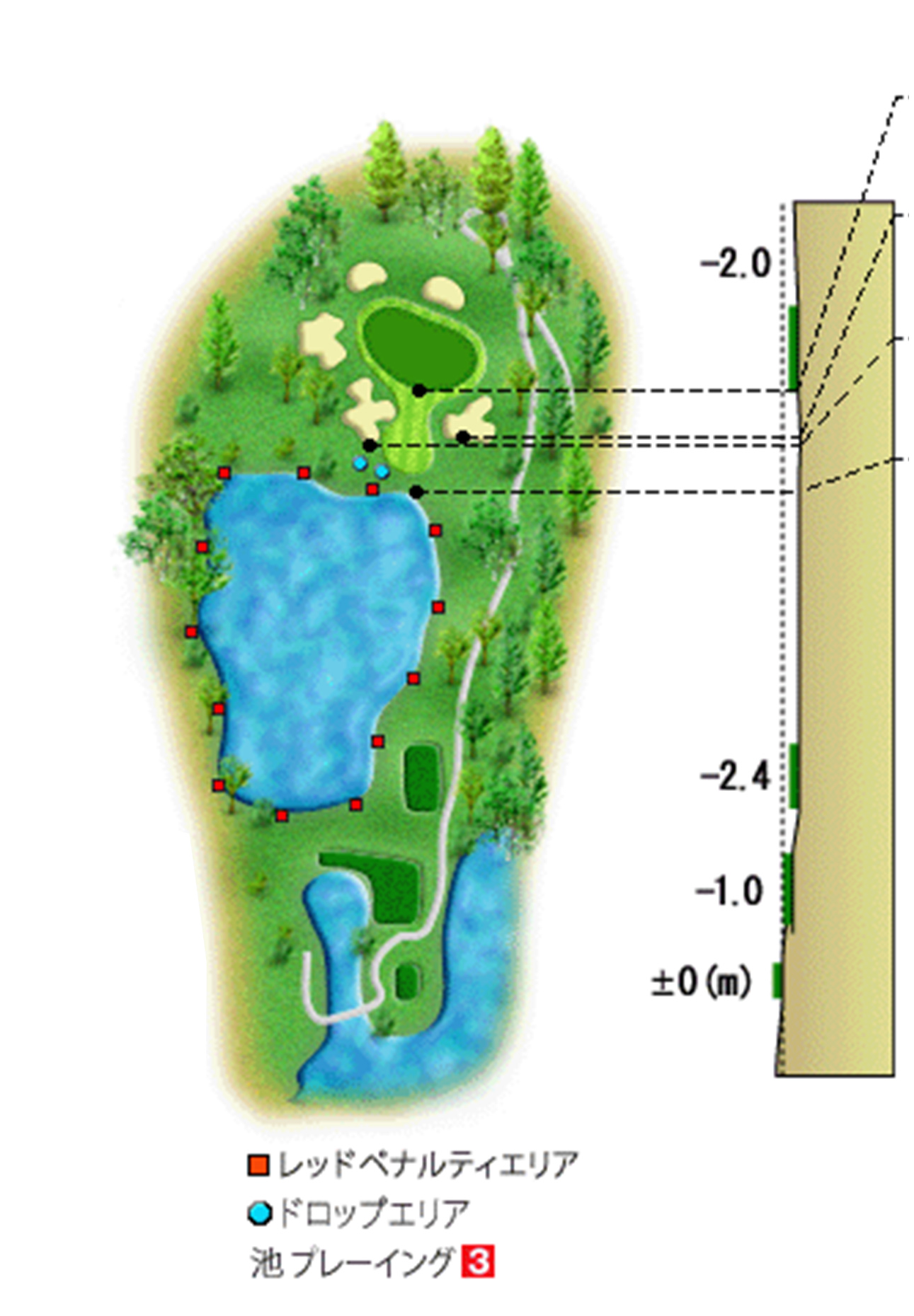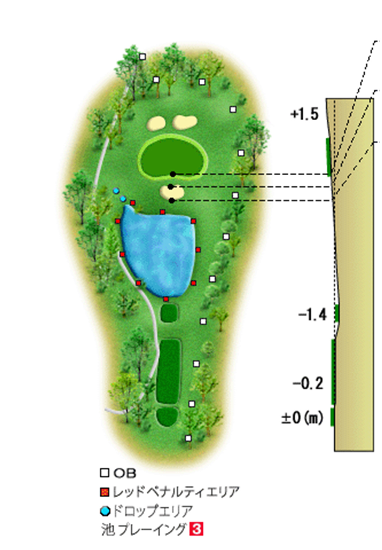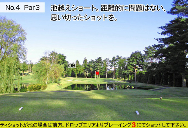池越え、距離のあるショート。クラブの選択に注意し力まずしっかり打つこと。第1打が池に落ちた場合前方のドロップエリアより第3打としてプレーする事が出来ます。