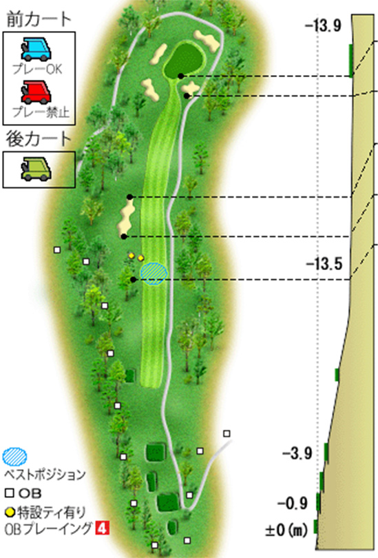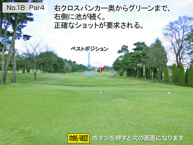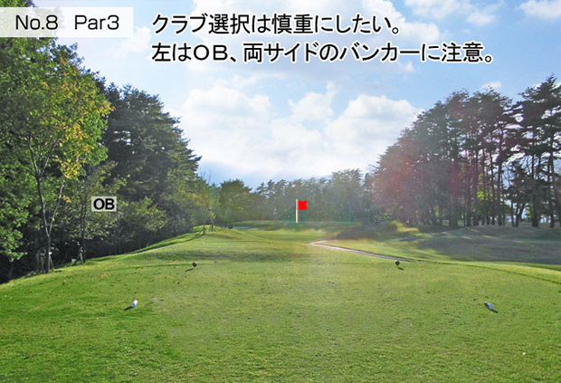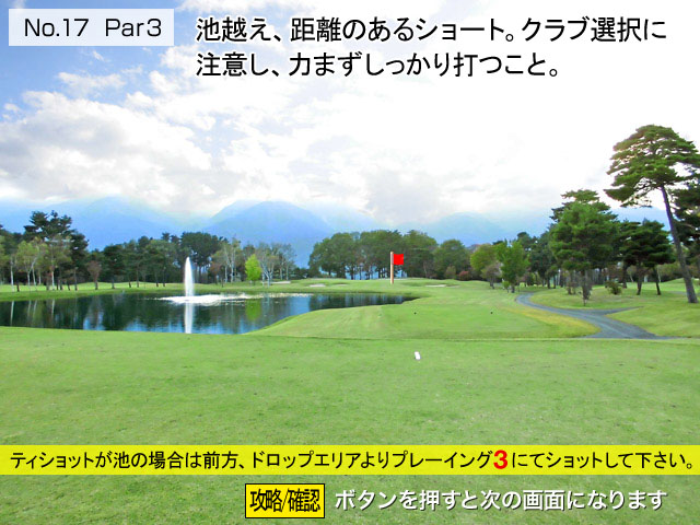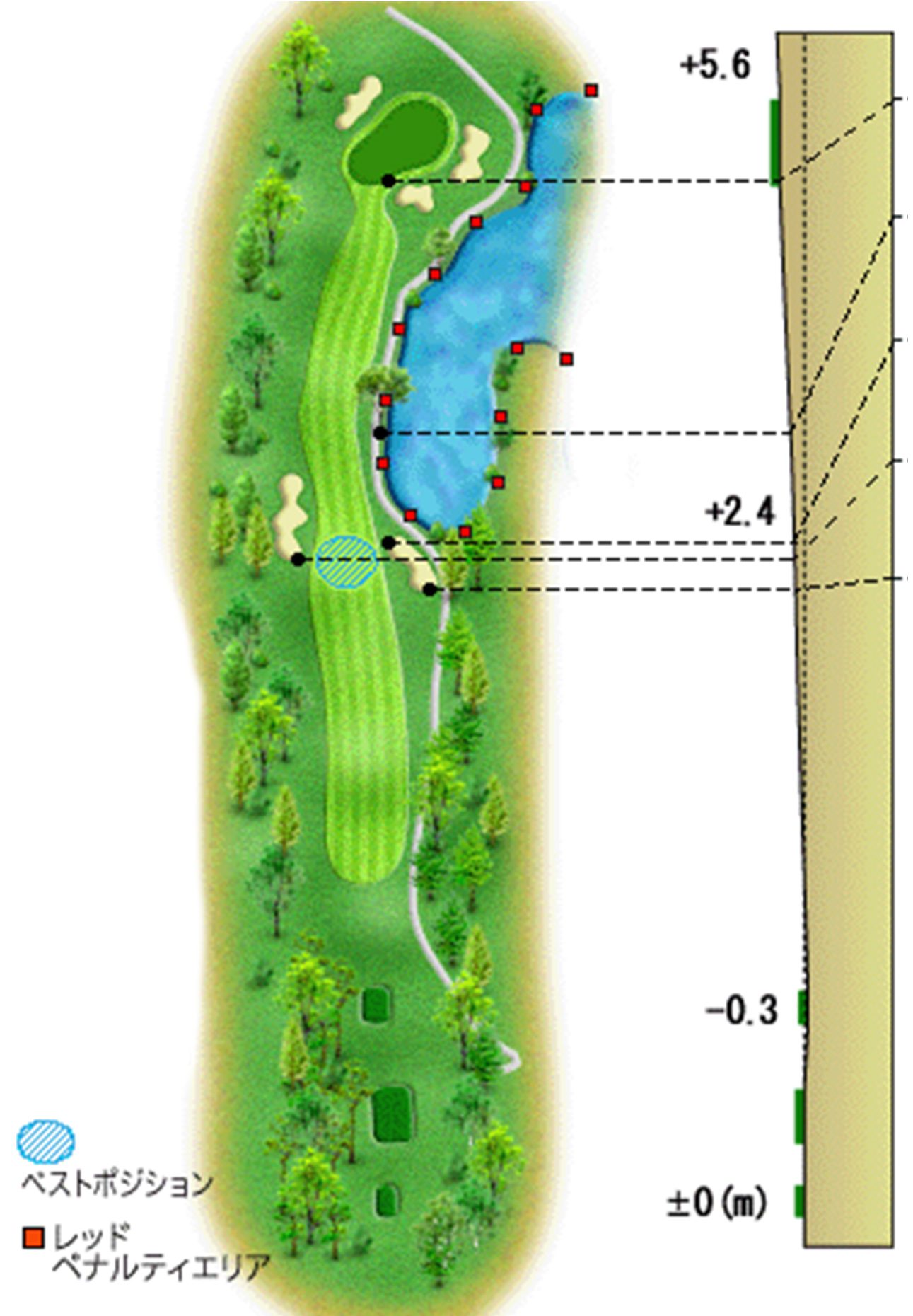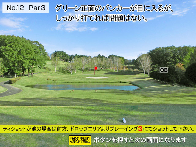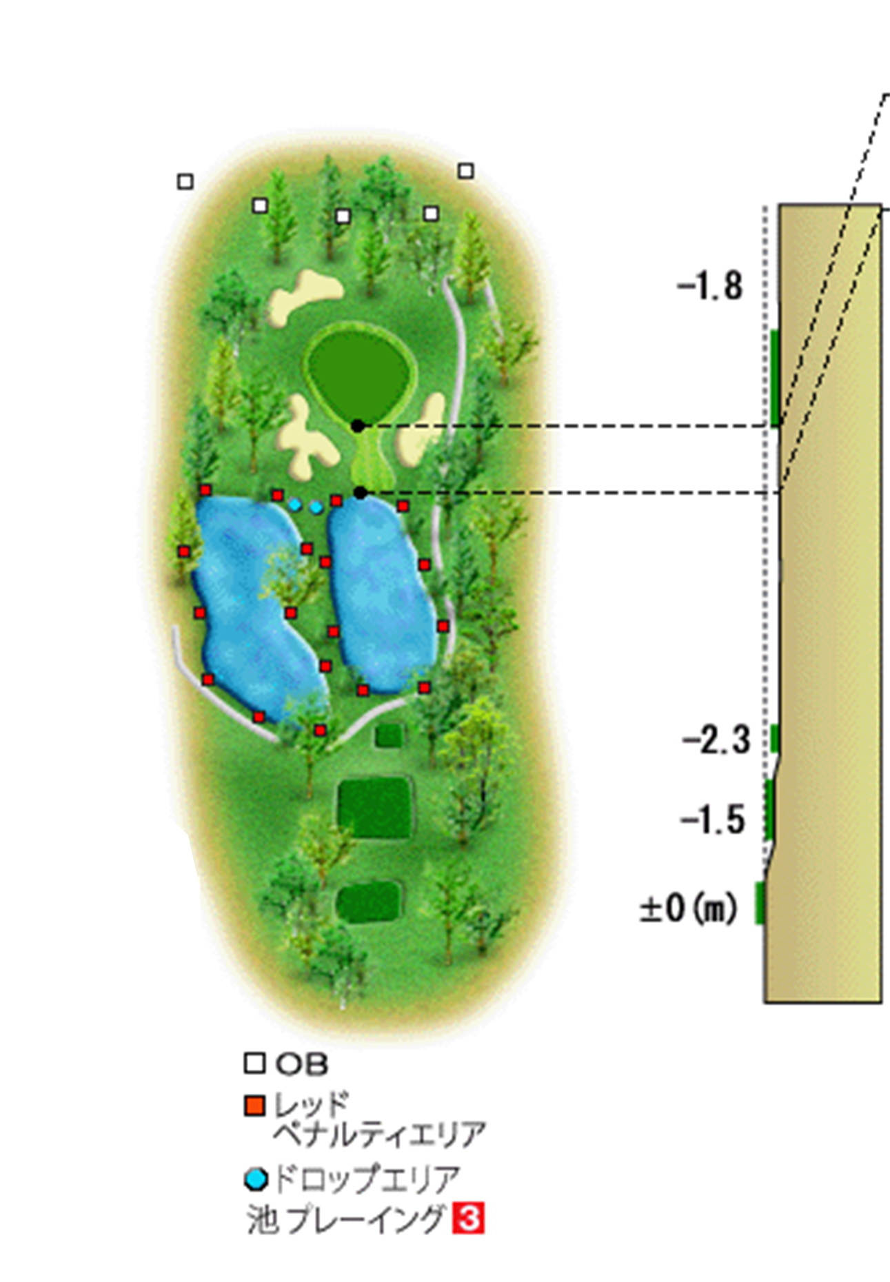 池越え、距離のあるショート。クラブの選択に注意し力まずしっかり打つこと。第1打が池に落ちた場合前方のドロップエリアより第3打としてプレーする事が出来ます。