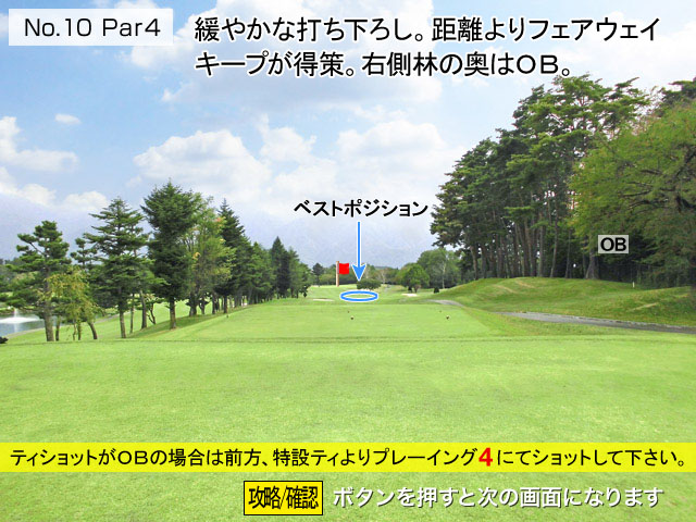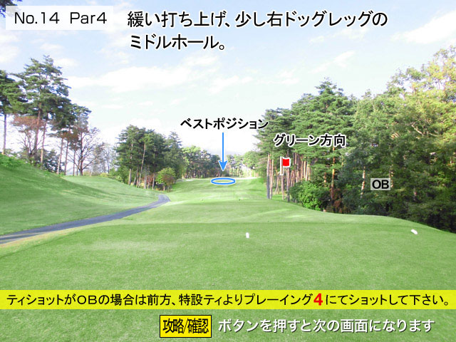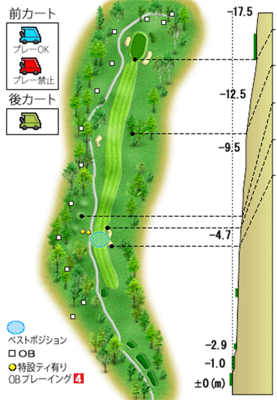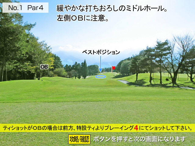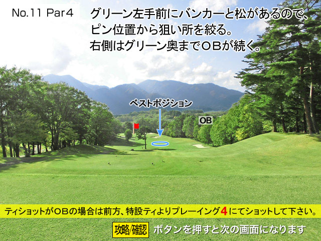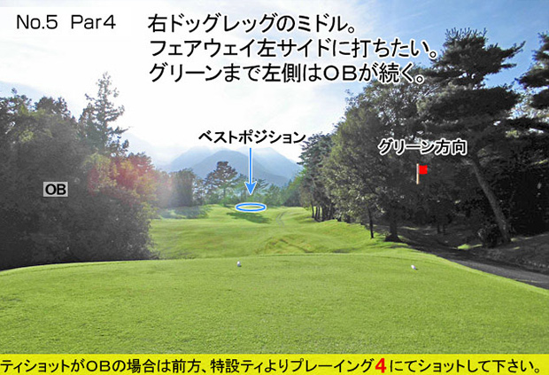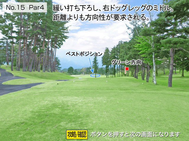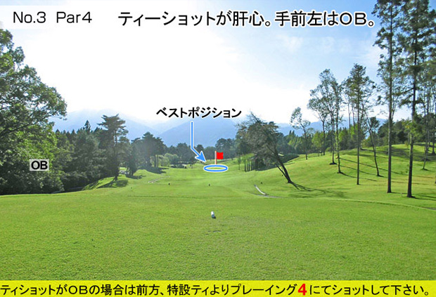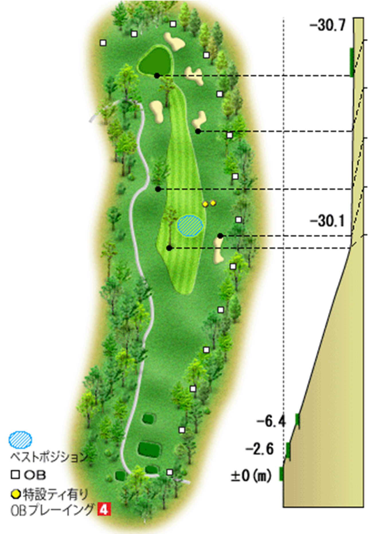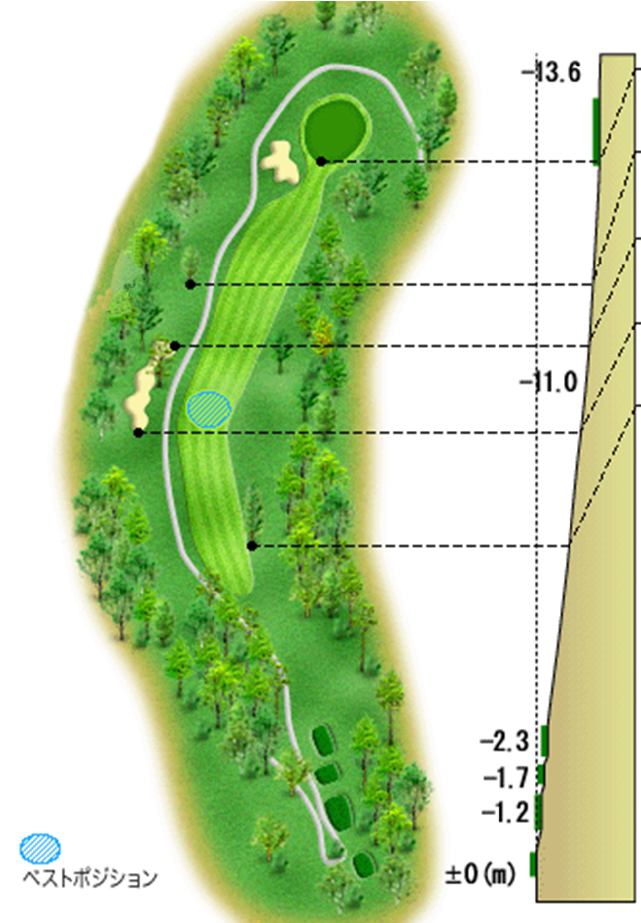 ダイナミックな打ち下ろしのミドル。左サイド松が狙い目。グリーンの左手前に、ガードバンカーがあるのでセカンドは右狙い。