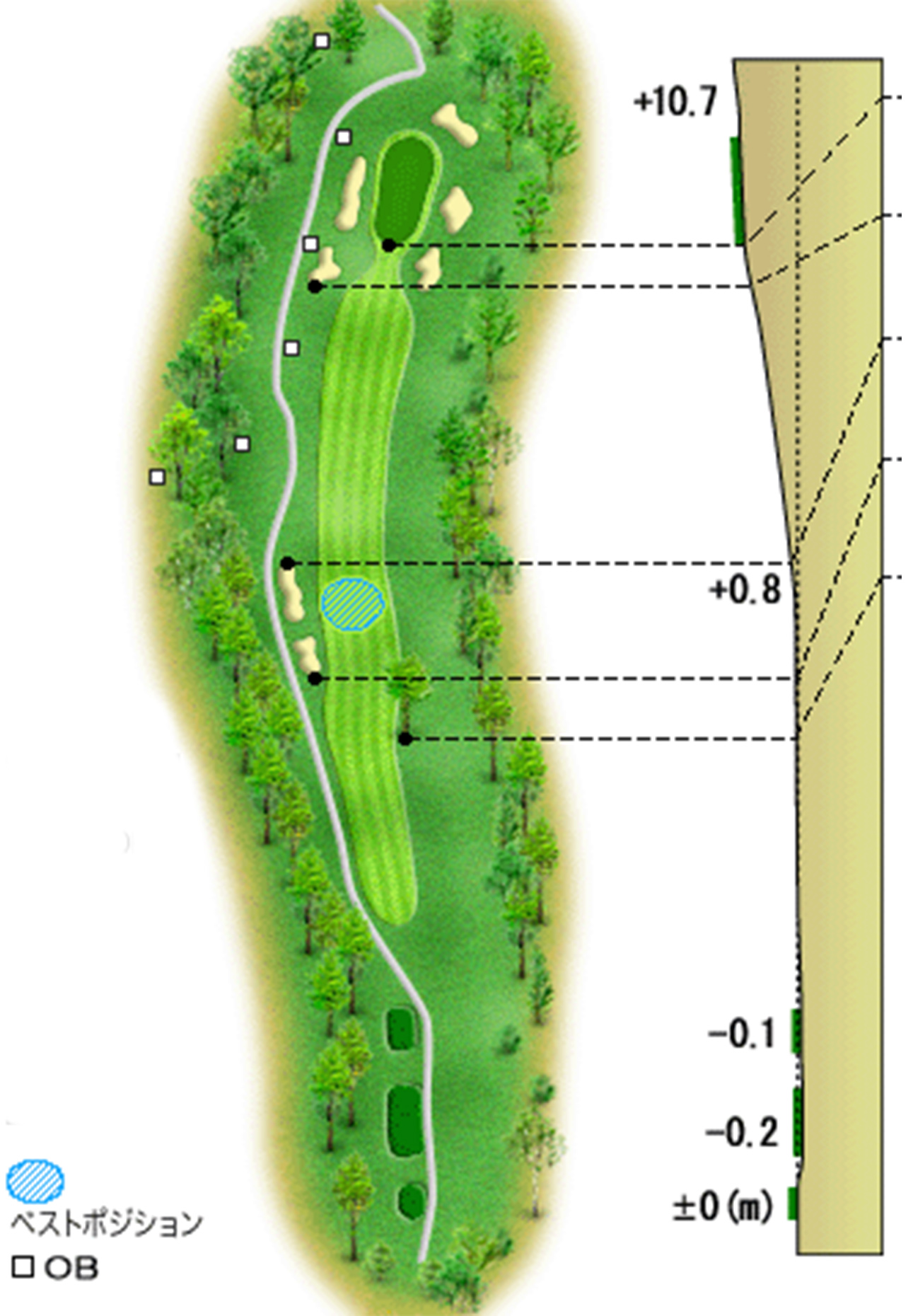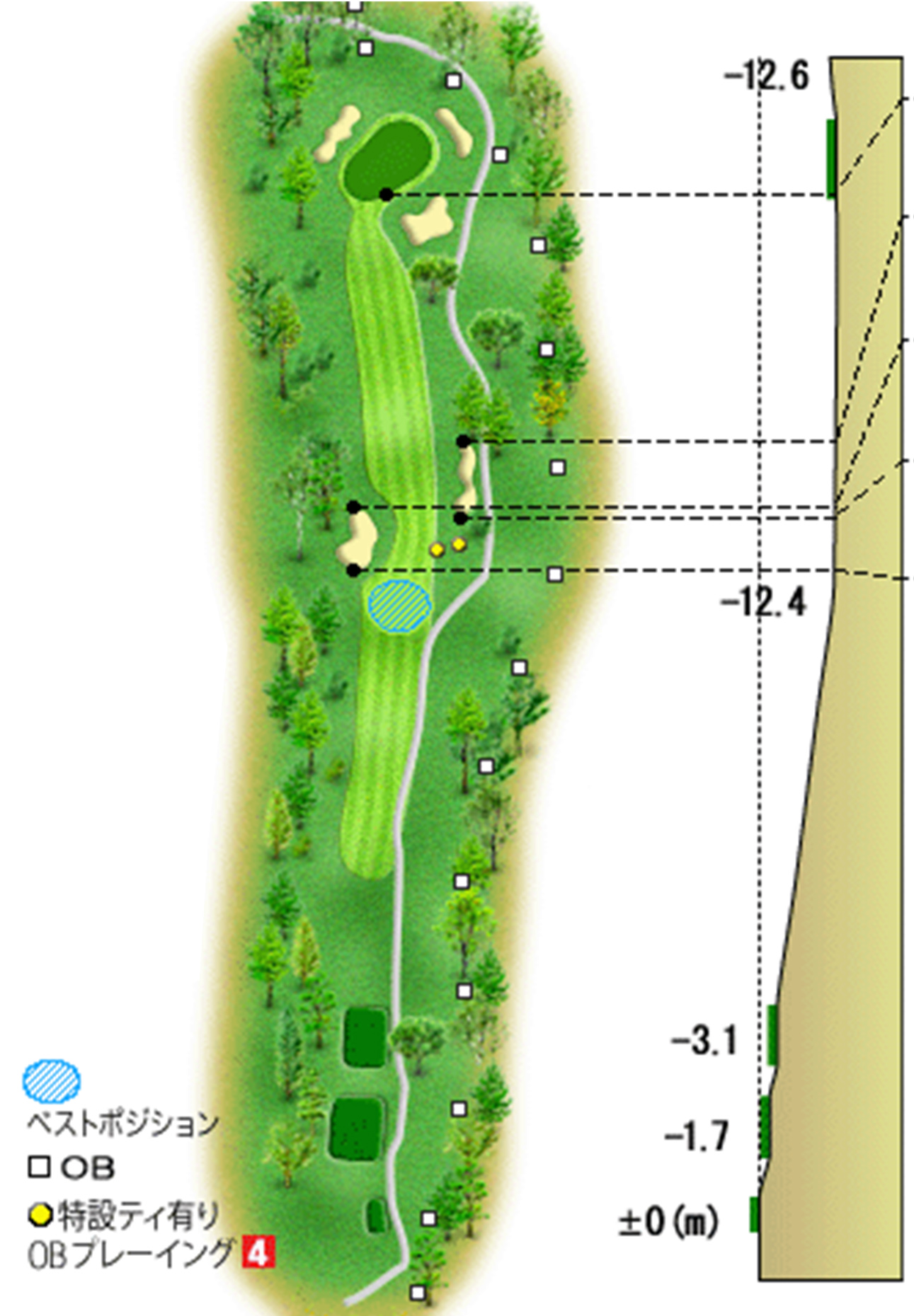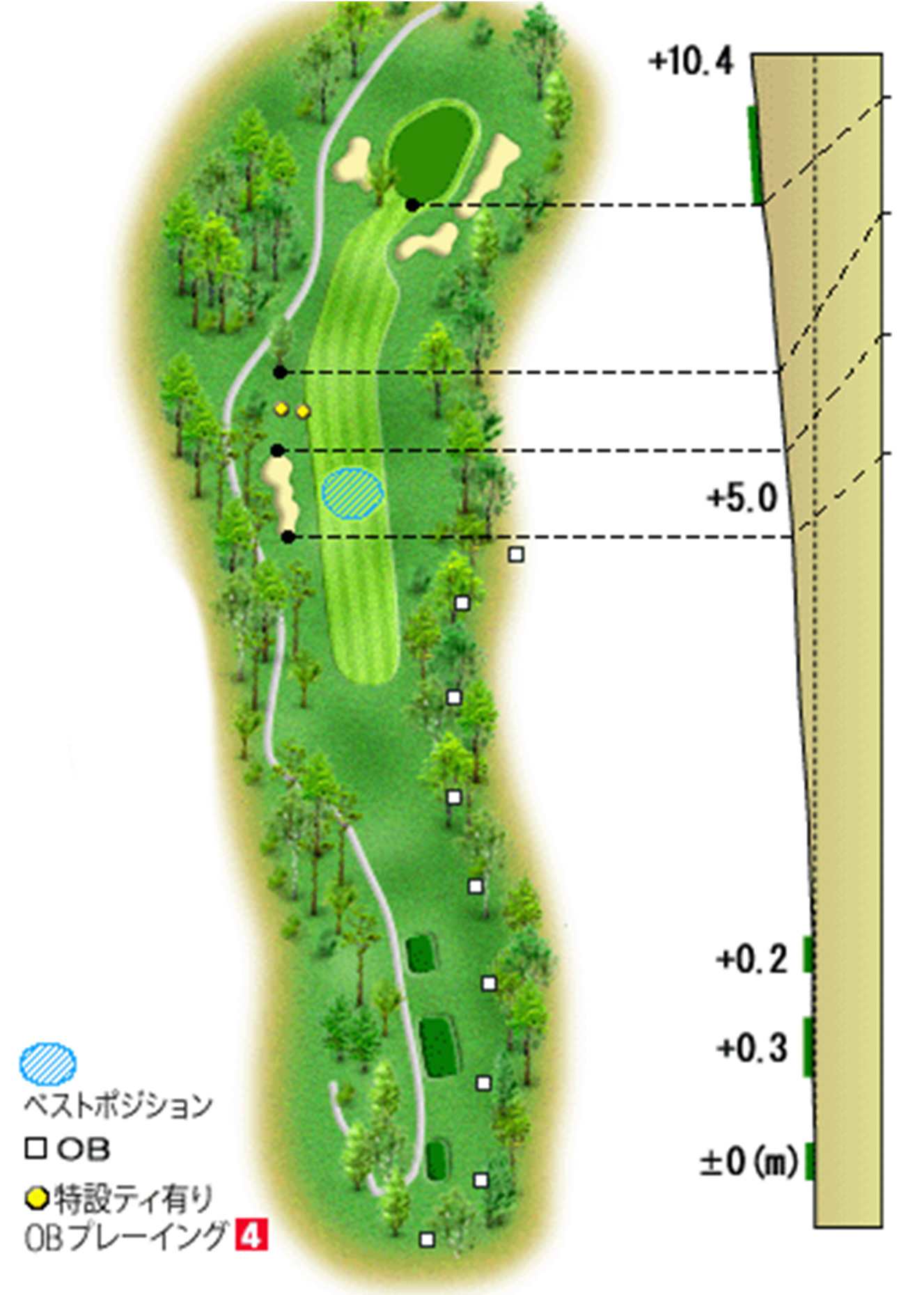 距離がある右ドッグレッグのロング。右サイドがOBの為ティーショットは左狙いが安全です。