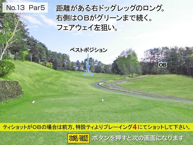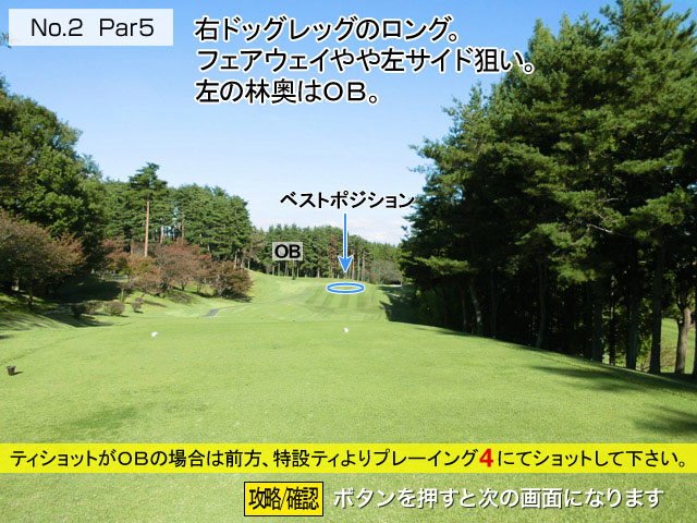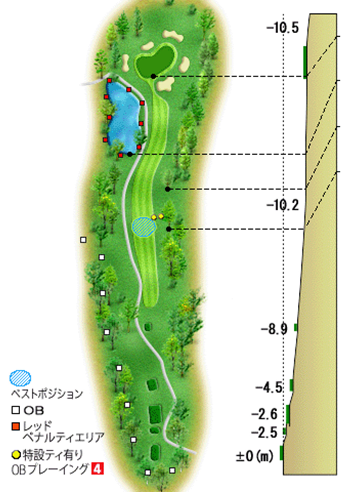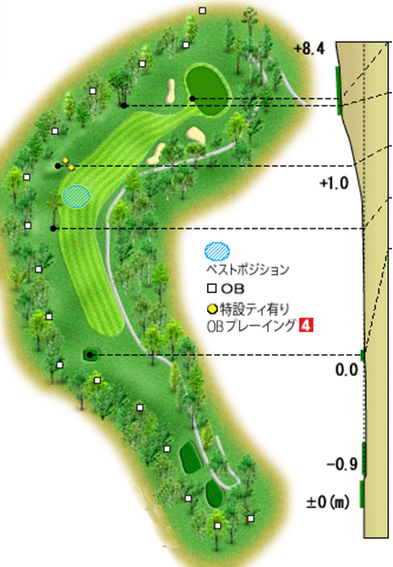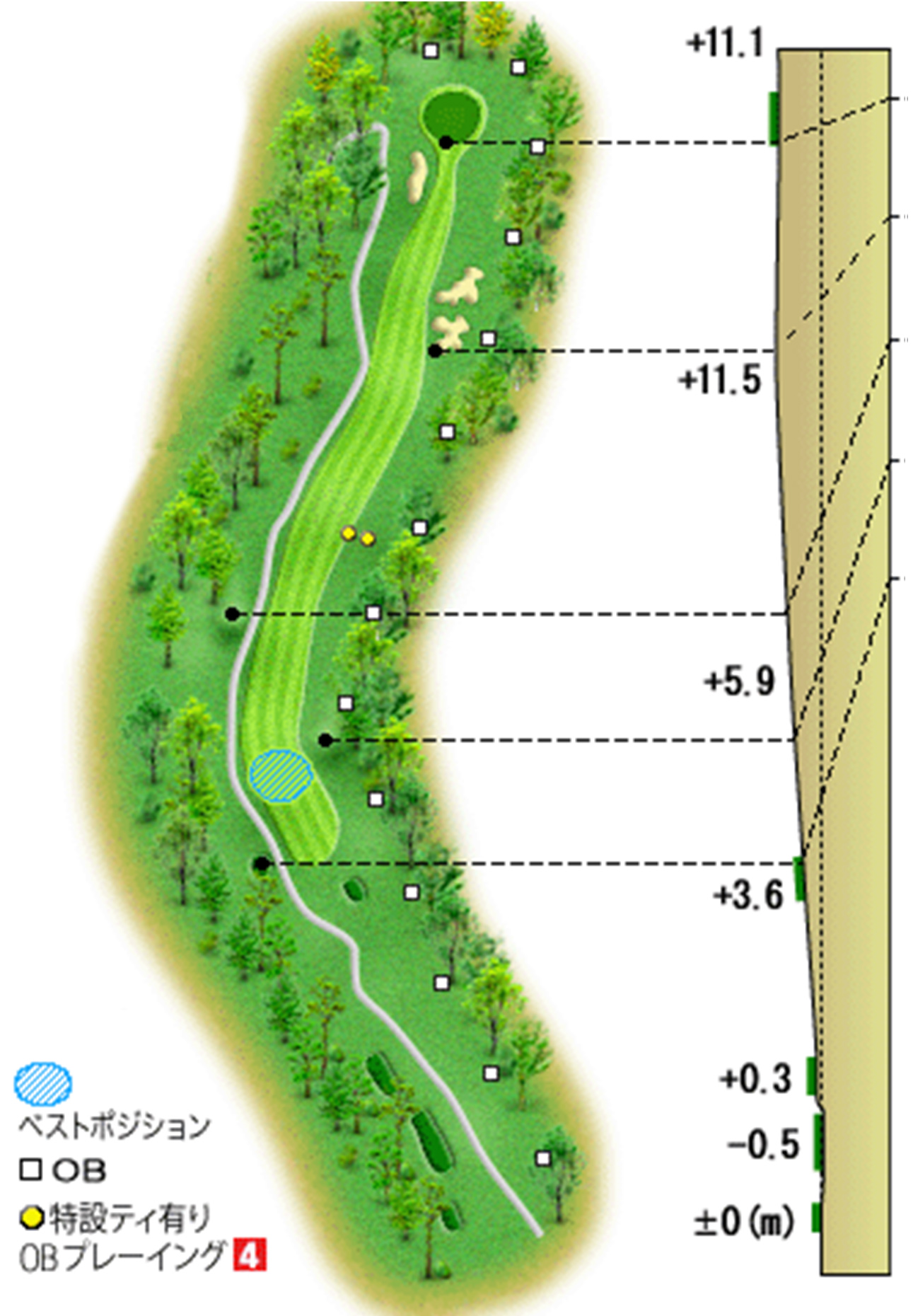 距離がある右ドッグレッグのロング。右サイドがOBの為ティーショットは左狙いが安全です。