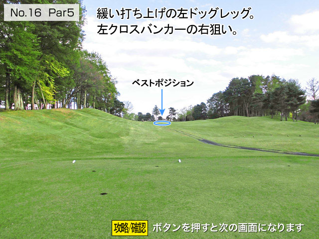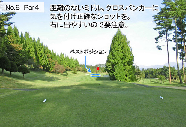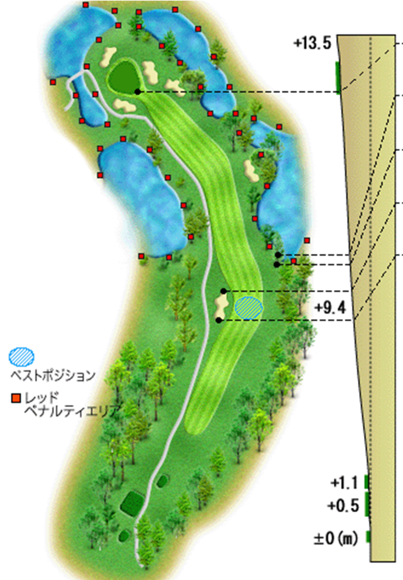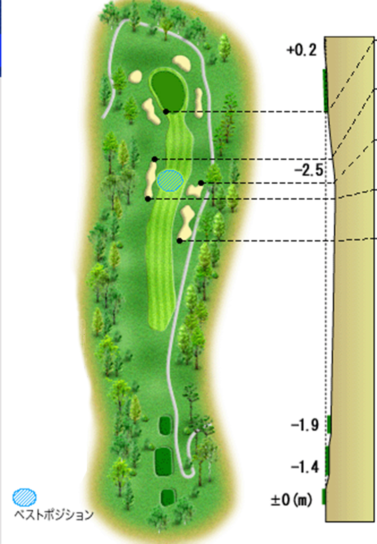 ゆるい打ち上げ。右ドッグレッグのミドル。左サイドのクロスバンカーに要注意。