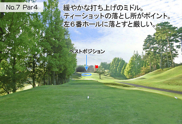 ゆるやかな打ち上げのミドル。ティーショットの落とし場所がポイント。