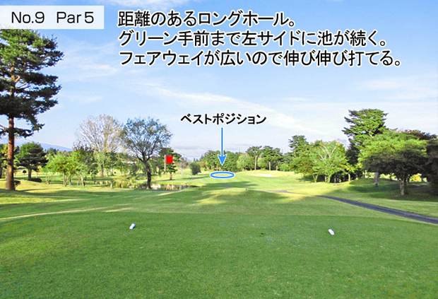 距離のあるロング。左サイドに池が続く。フェアウェー広く伸び伸びと。